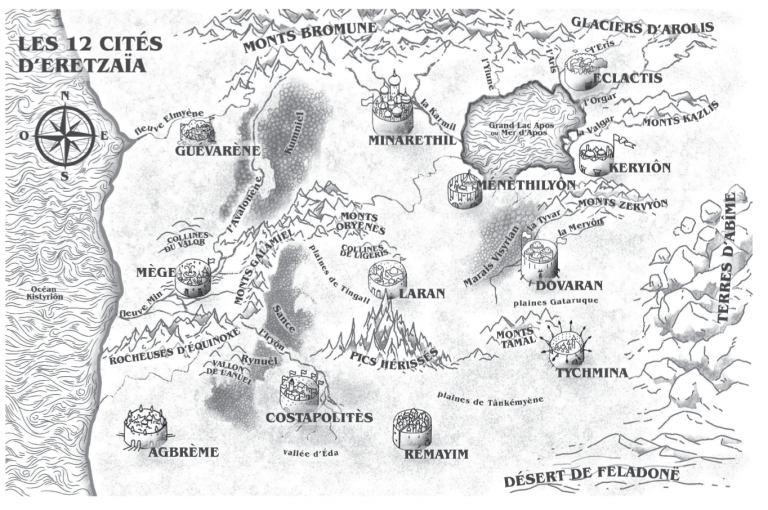 Malgré ces inégalités de destinée, aucune protestation ne s’élevait à Laran, car pour tous les citoyens, ce système bien huilé depuis des siècles garantissait la paix. L’inconscient collectif était profondément marqué par les nombreuses années de guerres qui avaient ravagé les différentes contrées du monde d’Eretzaïa il y a bien longtemps. Depuis ces jours obscurs, la crainte de sombrer à nouveau dans le chaos les avait amenées à s’isoler les unes des autres derrière des forteresses. Douze grandes cités-États avaient ainsi été fondées. Dès lors, les allées et venues furent strictement limitées au commerce et à la diplomatie ; sans autorisation des autorités, nul ne pouvait plus voyager ni se déplacer.